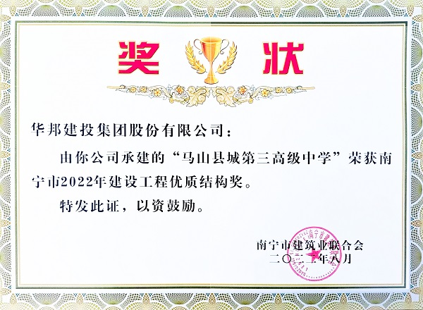 不断提升工程安全质量水平,获评“南宁市建筑业安全生产标准化示范企业”、“南宁市2022年建设工程优质结构奖”,充分展现了华邦建投在房建领域的建设实力,也是对华邦建投先进管理经验的充分肯定。