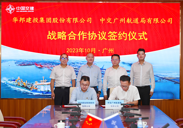 在姜松(右二)、王权(左一)、胡智荣(左二)、蔡继荣(右一)等见证下,华邦建投集团与中交广航局签署战略合作协议